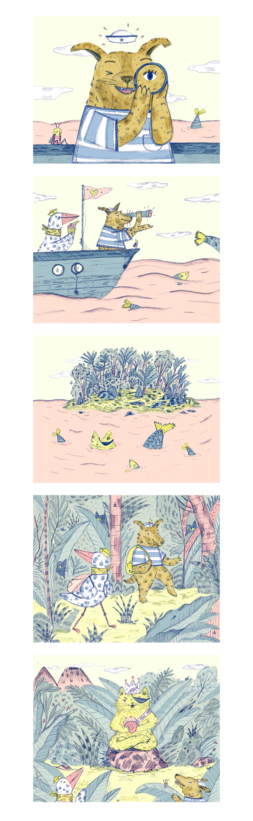 Serie de ilustraciones sobre las aventuras marinas de 3 simpáticos animales